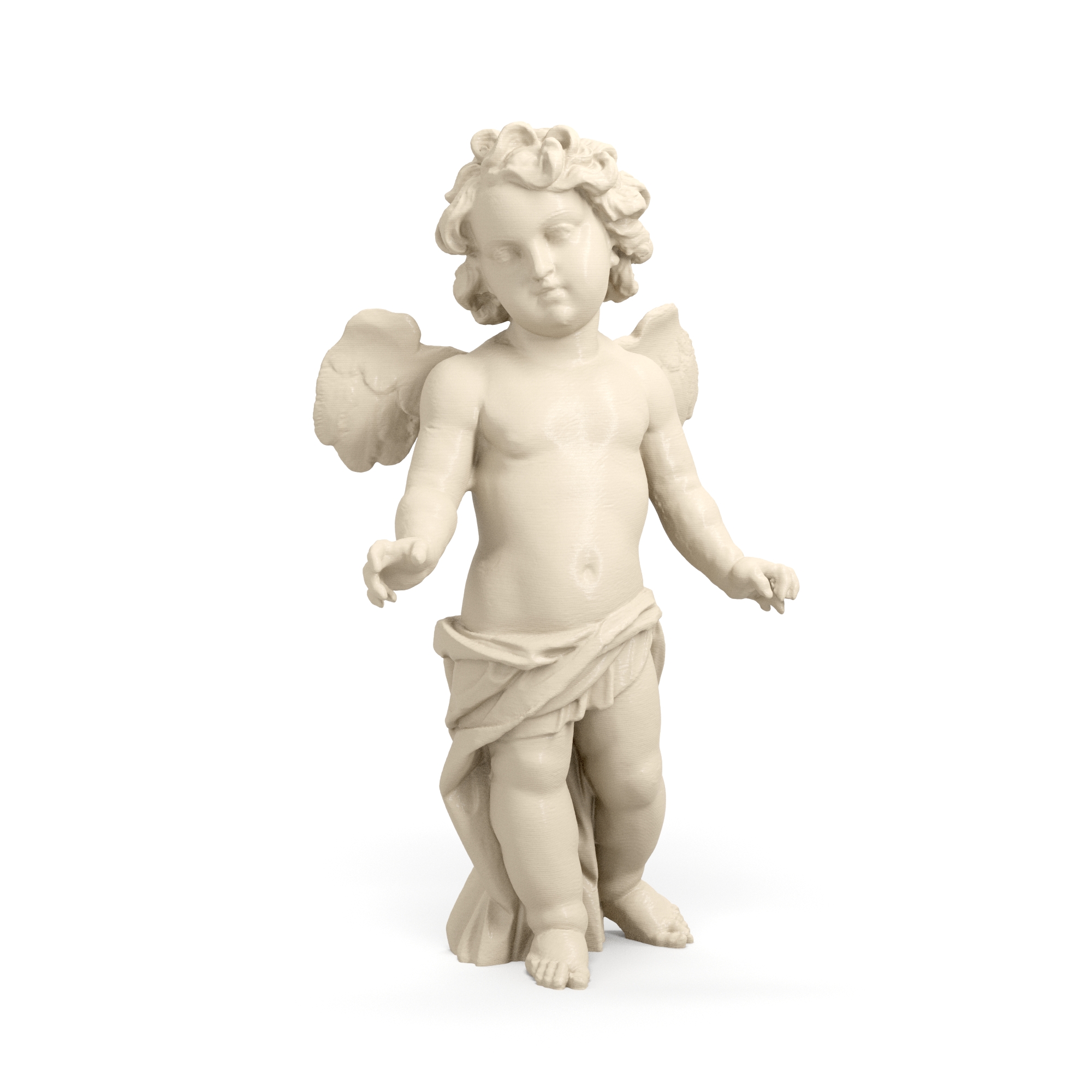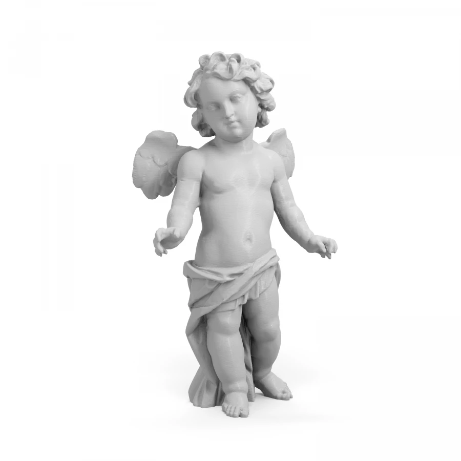 The stance of the Putto is dynamic yet balanced, with one leg slightly forward suggesting movement while the other supports the weight, creating a naturalistic pose that conveys both innocence and a hint of playful mischief. The wings are modest in size and delicately textured, enhancing the supernatural aspect of the figure without overpowering the human form. The expressivity of the figure is captured in its serene yet slightly pensive facial expression, reflecting the Baroque era's fascination with dramatization and emotion.
