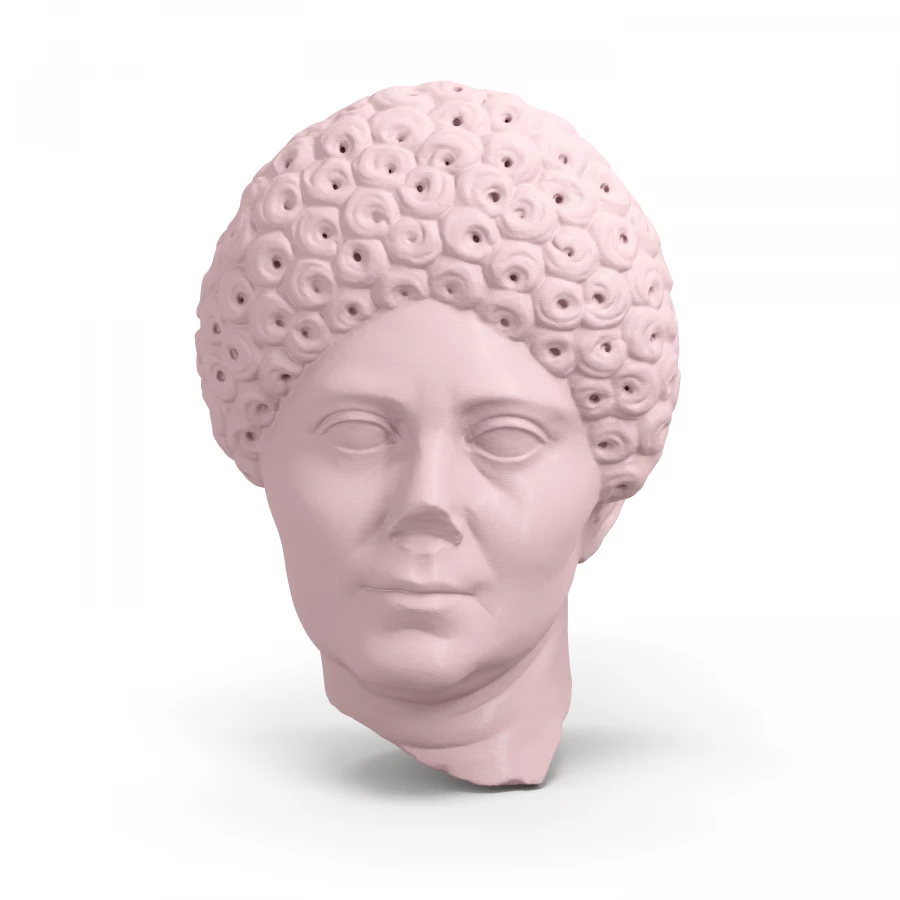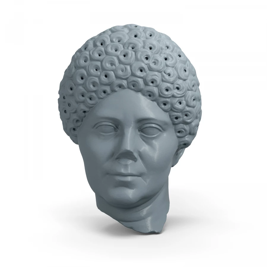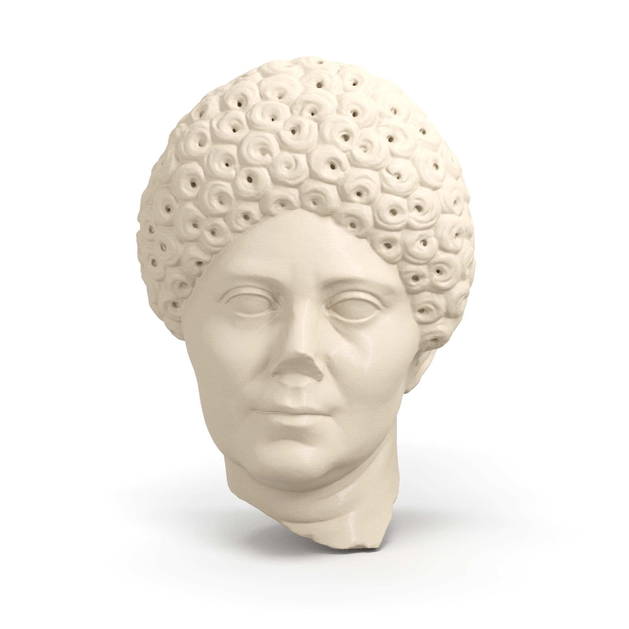 The subject is depicted with soft facial features that include well-defined cheekbones, a rounded chin, mildly arched eyebrows and a subtle expression with the lips closed, aiming to convey a sense of solemnity and dignity. The eyes are blank, typical of many ancient stone sculptures, which sometimes had inlaid eyes made of different materials or were painted. The hairstyle is particularly notable, characterized by elaborate curls piled on the top of the head, a typical fashion for noblewomen in the Roman Empire. This intricate pattern, with rows of curls and braids coiled into a bun, is a testament to the elaborate craftmanship of Roman sculptors and acts as an important piece of visual culture of that time, indicative of the beauty ideals of the era.