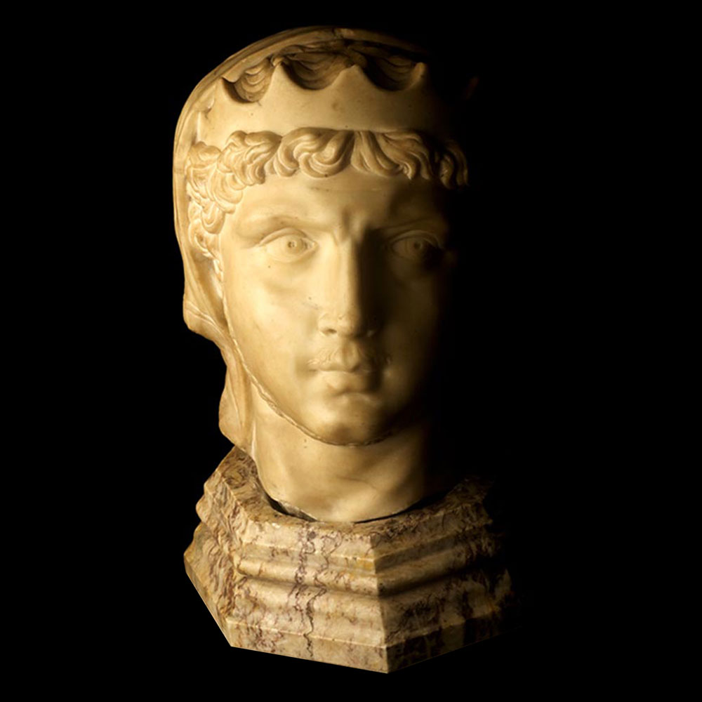The strong jawline, the deeply carved eyes, the crown above a band of hair that encircles the forehead, all these features are sculpted to enhance the regal image.
