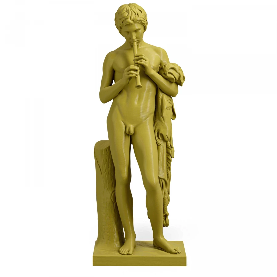 The figure's head is inclined downward, focusing intently on the flute held delicately in his hands. Pan's goat-like ears can be subtly observed, blending seamlessly with his human features, while his tail is gently draped behind him, adding an element of mythical charm.