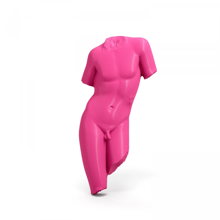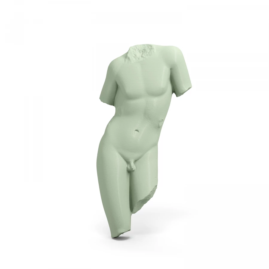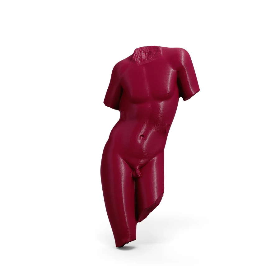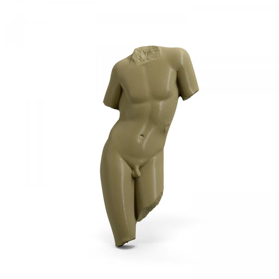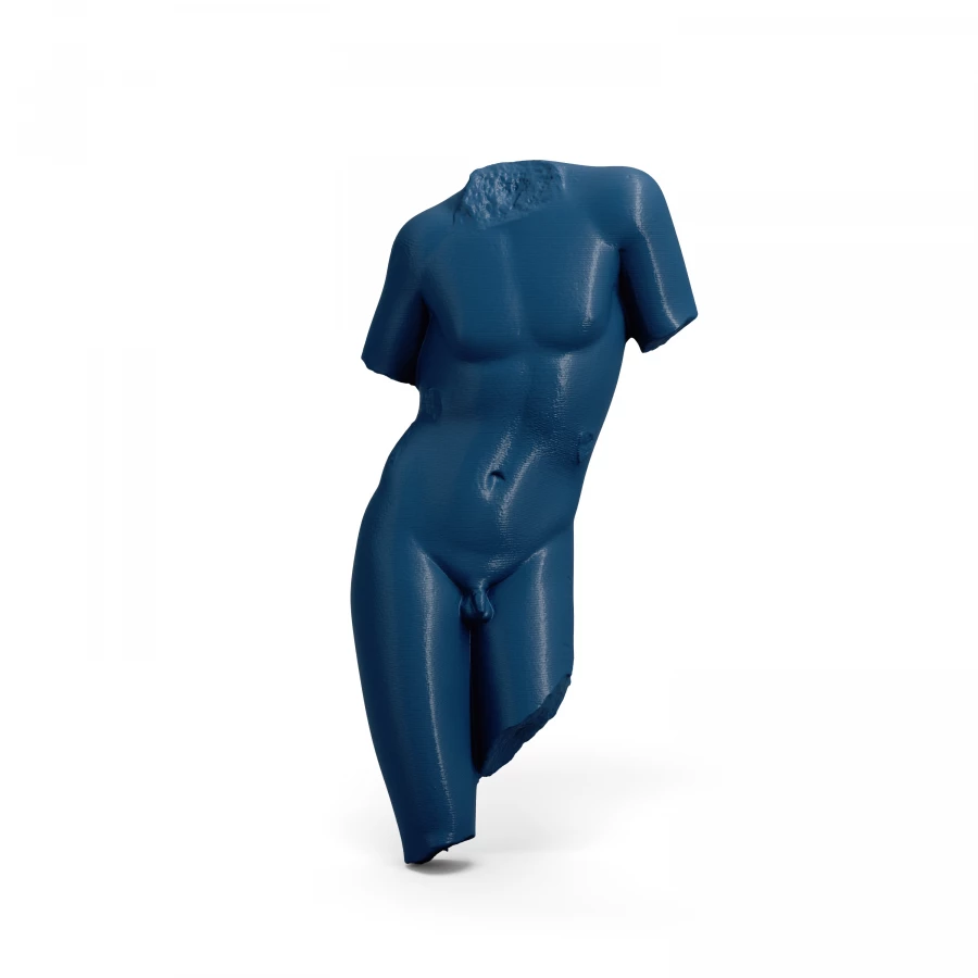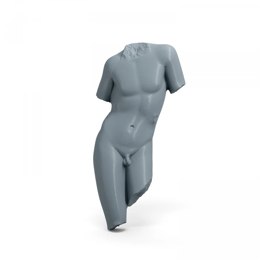 The artclone features a partial representation of a male figure lacking its head, arms, and parts of its legs, emphasizing the torso and the upper section of the legs. The sculpture is shown with the hips and shoulders rotated slightly in opposite directions to create a dynamic posture. The model captures fine anatomical details such as the abdominal muscles, the chest, and the subtle definition in the back and sides, suggesting a strong, physically fit subject. The pose itself, although static, offers a sense of life, likely intended to convey the physical prowess or a moment of action of the figure it represents.