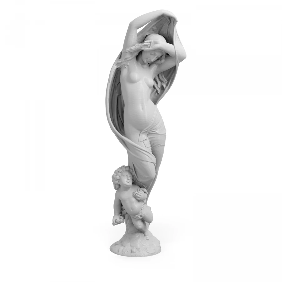 The figure stands upright with a dynamic, swirling posture that suggests motion. Her right arm is gracefully raised above her head, holding a portion of the veil, while her left arm crosses her body in a sweeping motion that enhances the sense of movement. This positioning, along with the curvature of her body, demonstrates a sinuous line of action that guides the viewer's eye throughout the composition, from her feet to her extended arm. Anatomically, the statue exhibits a detailed and accurate depiction of the human body, with a focus on the musculature and the way the flesh deforms slightly under the pressure of the veil. Supporting the dancer is a smaller figure at her base—a cherub, which adds a classical, possibly mythological element to the piece. The cherub looks up adoringly, perhaps in admiration or as a spectator of her dance, reinforcing the theme of performance and beauty.